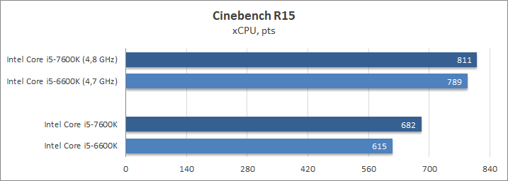 Аналогічна картина в Cinebench R15 - непогана перевага Core i5-7600K пере опонентом в номіналі і невелика різниця між тестованих рішеннями після розгону.