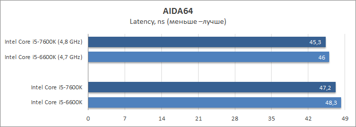 Як бачимо, новинка трохи відстає він опонента при читанні даних в тесті AIDA64, але при цьому швидше пересилає їх при копіюванні. Розгін дозволяє нівелювати різницю, але не в останньому подтестов - там Core i5-7600K все одно продуктивніше. Також він може похвалитися низькою латентністю щодо Core i5-6600K.