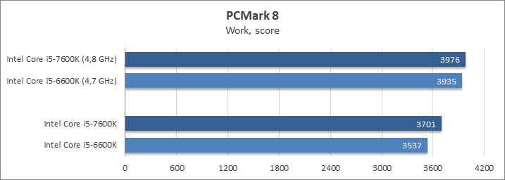 У синтетичному пакеті PCMark 8, який симулює реальні повсякденні завдання, наш процесор запросто обходить «дідка», але з розгоном він швидко втрачає всю свою спритність.
